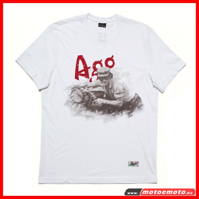 Tratta da una foto privata di Giacomo. Uno stile anni 70, heritage. Una t-shirt che è capo di moda e memorabilia insieme. Design e morbidezza di tessuto. Giacomo Agostini non è solo un’icona per gli appassionati di motori, ma trasmette anche eleganza, fascino e bellezza.